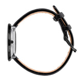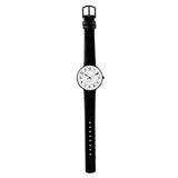 Enkelt og klassisk herrerur i 40 mm, med sort læderrem, hvidskive og sorte tal.