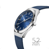 Dameur med mørkeblå mesh-lænke, safirglas og urkasse i rustfritstål. Vandresistent til 3bar. Kassens højde målåer 5,2 mm og remmens brede måler 14mm.