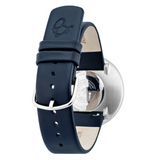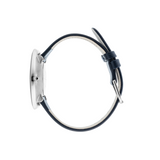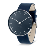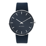 Enkelt og klassisk ur fra Arne Jacobsen, med mørkeblå skive og rem (næsten sort).