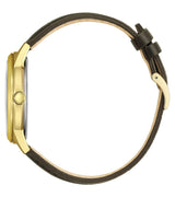 Uret kommer med en guldfarvet urkasse i rustfrit stål, brun læderrem og dato og ugedag.