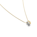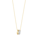 Georg Jensens ikoniske FUSION kollektion, forener elegance og symbolik i et unikt smykke. Dette vedhæng består af to perfekt sammensatte emner, der hænger side om side i en 45 cm spinkel guld ankerkæde. Hele smykket er fremstillet i 18 kt guld, hvor den ene del af vedhænget er i hvidguld. Denne del er dekoreret med i alt 0,22 ct. brillantslebne diamanter.
