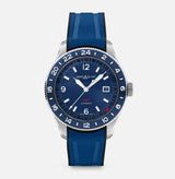 Where most GMT timepieces indicate the second time zone with an additional hand, the Montblanc 1858 GMT features a GMT indication without hands that is very intuitive and highly legible. The Montblanc 1858 GMT indicates the second time zone with a red square that moves around the outside of the dial. This red square is positioned next to a fixed black anodized aluminum bezel with a 24-hour clock. This system also indicates half hours. Other functions include a date and central seconds hand. The timepiece is housed in a 42 mm stainless steel case and comes with a blue sunray dial as well as an interchangeable blue rubber strap with fine adjustment system. An engraving on the case back shows the continents, oceans, and names of cities in each of the 24 time zones, offering a world time indication.