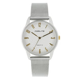 Dameur med sølvfarvet skive og mesh-lænke med guld tal. Ur-kassen måler 32 mm og er vandresistent til 5bar.