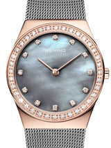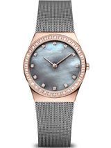 Gråt dameur med mesh-lænke og perlemor urskive. Uret er sat med en krans af swarovski og har 12 sten sat på urskiven. Urkassen er i rosa guld rustfritstål og måler 30 mm. Uret er vandresistent til 5bar.