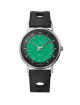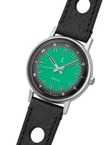 Unisex stål ur med grøn/sort urskive. Design inspireret fra 1960 med sort læderrem. 36 mm.