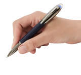 StarWalker SpaceBlue ser ud over planeten jorden og vender sig mod stjernerne og galaksen. Fuldstændig maskulin og futuristisk bringer denne nye StarWalker-kollektion et nyt look til harpikshætte og -tønde med et design, der minder om de indviklede strukturer i Widmanstätten-mønsteret, en af naturens mest hypnotiske kreationer. Alle metaldele er belagt med mørk ruthenium, ledsaget af en dyb rum-blå tone til den matte ædle harpiks, der minder om nuancerne af en stjernehimmel. Også subdomen på hættens top, som Montblanc-emblemet svæver over, kommer i en dyb rum-blå farve.