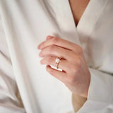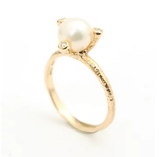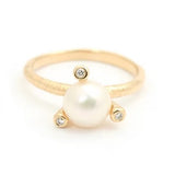 Twigs ringen med en hvid saltvands perle og tre diamanter i alt 0,03 ct. TW/VS. Ringen er lavet i 14 karat guld og selve ringskinnen har en rustik overflade.