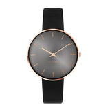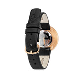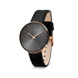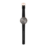 Stilrent og lækkert dameur, med rosa guld detaljer i urskiven og på spændet. Uret kommer med en sort læderrem og en mørkegrå metalik urskive. Urkassen måler 34 mm i diameter.